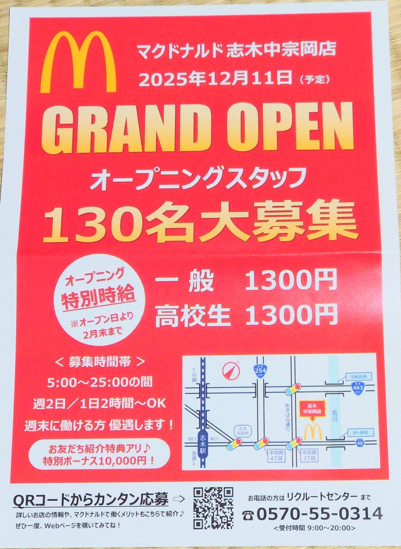 【志木市】志木市初のドライブスルーのマクドナルド志木宗岡店が12月11日(予定)にオープン!【オープニング特別時給でスタッフ募集中】