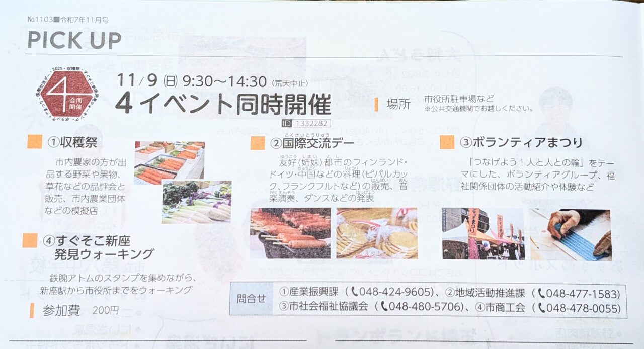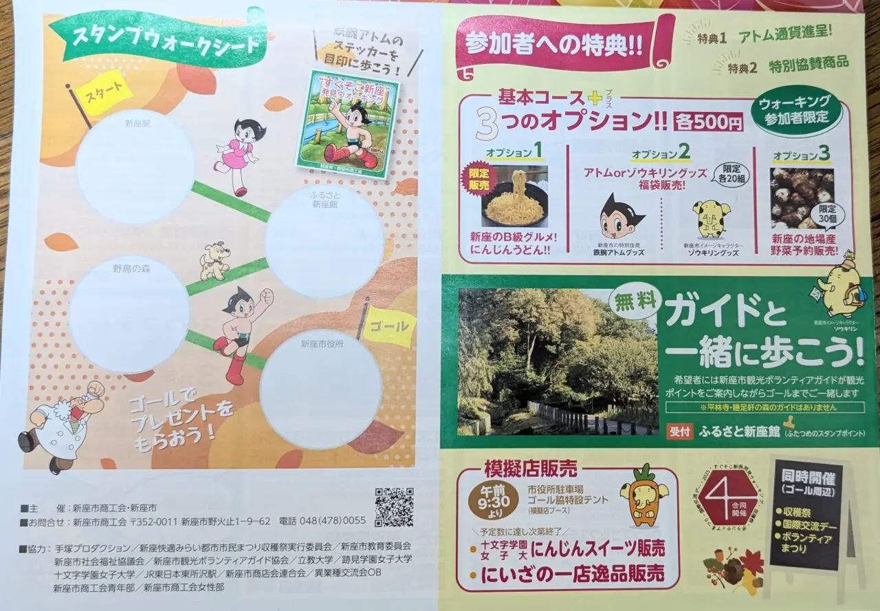 【新座市】アトムが案内!すぐそこ新座発見ウォーキング11/9開催!市役所では収穫祭!国際交流デー!ボランティアまつり!と4つのイベントが同時開催!