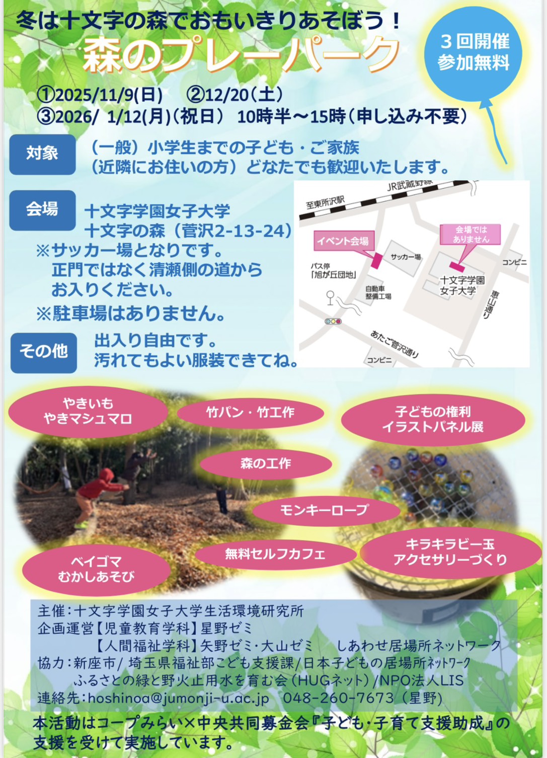 冬は十文字の森でおもいっきり遊ぼう! 今年度も十文字学園女子大学生活環境研究所の主催による「森のプレーパーク」が十文字の森で開催されます