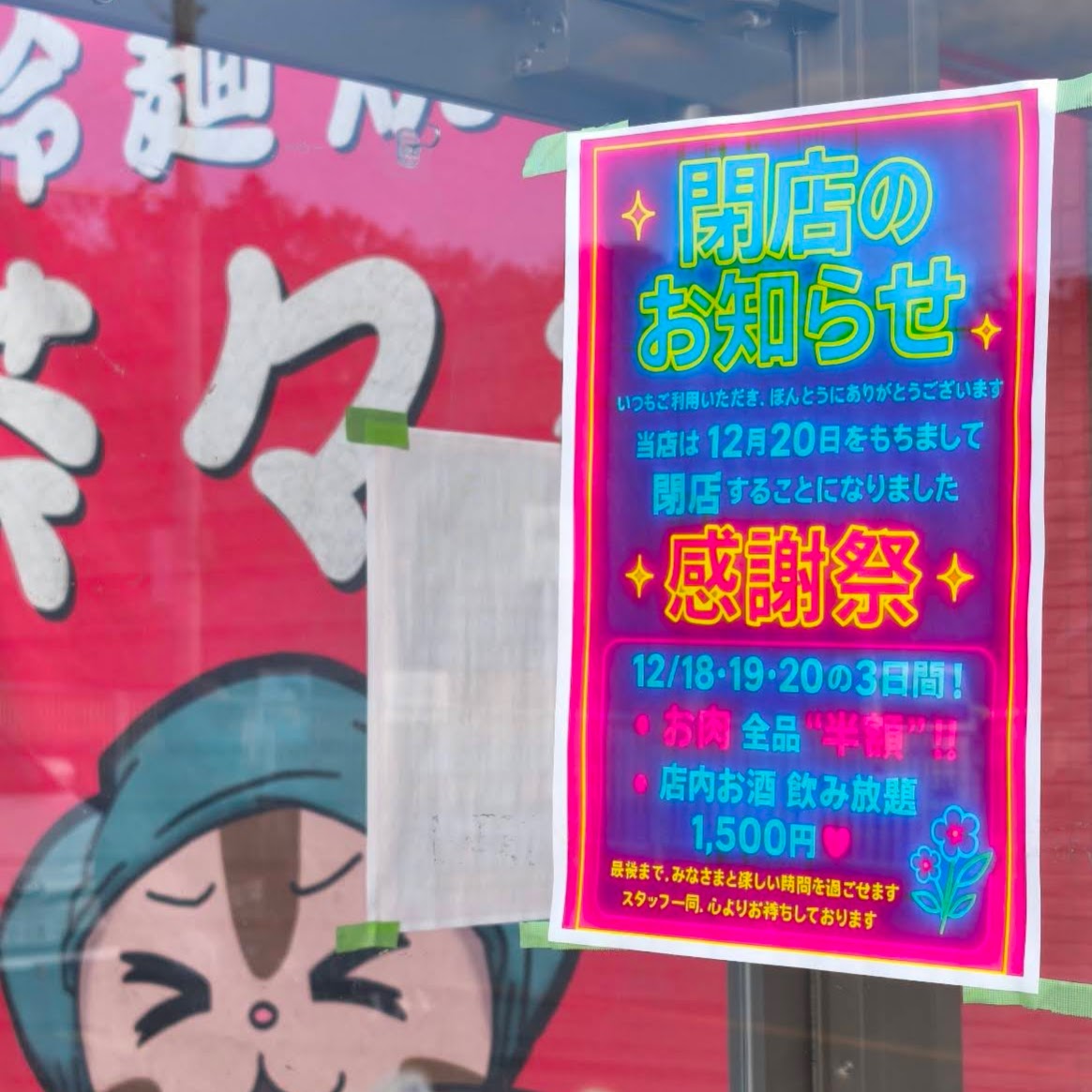 【新座市】残念です「冷麺焼肉 茶々丸」が12/20閉店【12/18から3日間は感謝祭・お肉全品半額・店内お酒飲み放題1500円】