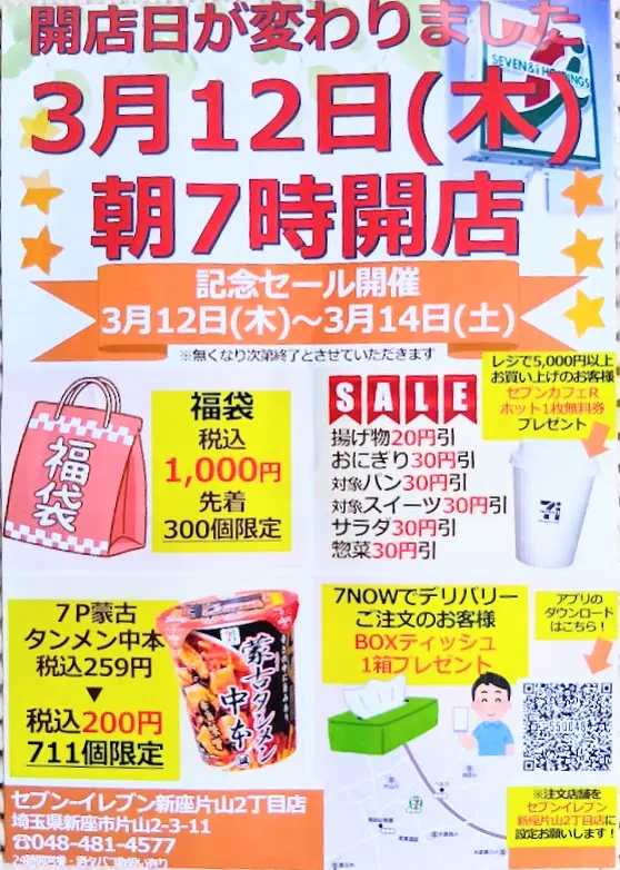 【新座市】駐車場が広すぎる⁉︎「セブンイレブン 新座片山2丁目店」が3月12日オープン。記念セール情報も!大型車も安心の利便性!開店日がかわりました!
