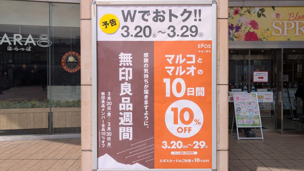 【志木市】3月20日から3月29日限定 マルイファミリー志木で無印良品が実質19%OFF!マルコとマルオと良品週間が重なる奇跡の10日間【志木のマルイは全国でも激レアな店舗なのだ!サクヒムでも紹介! 】