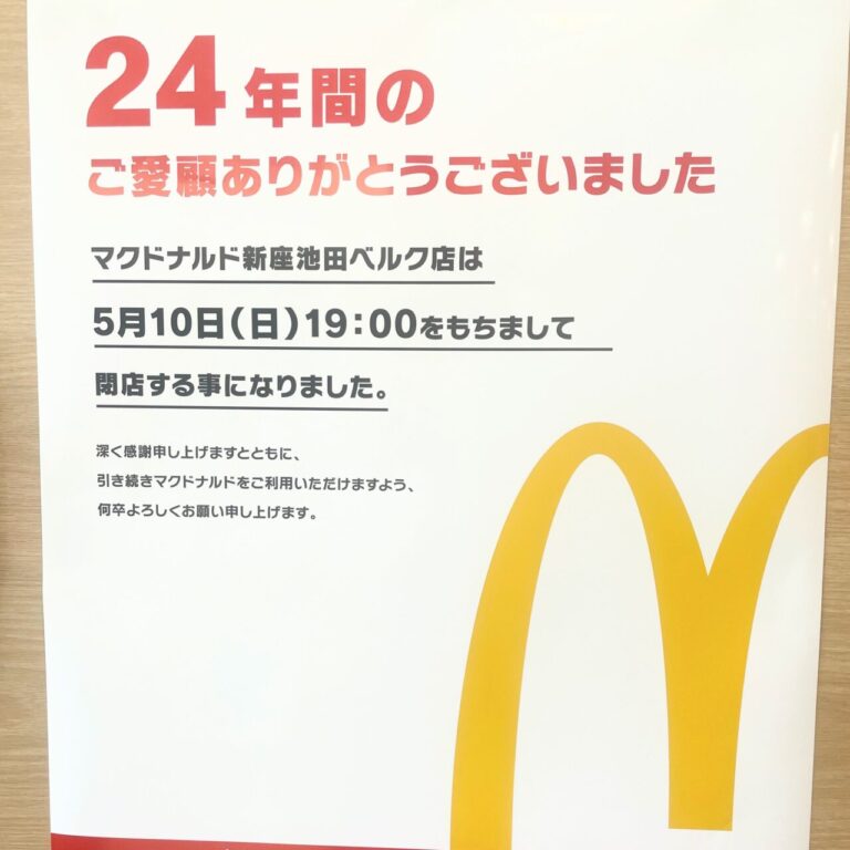 空白の期間に注意: 5月11日から6月29日までの間、近隣の池田・道場エリアではマクドナルドの営業が一時的になくなります。その間は、先日ご紹介した「朝霞台駅前店」や「254三芳店」を上手く活用してくださいね。